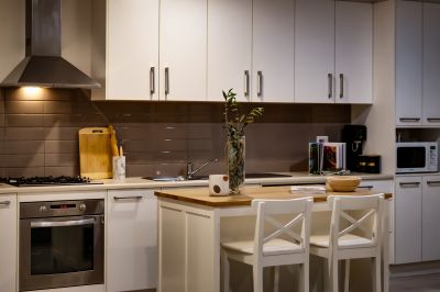 * Modern kitchen with gas cooking, ample storage, and central island