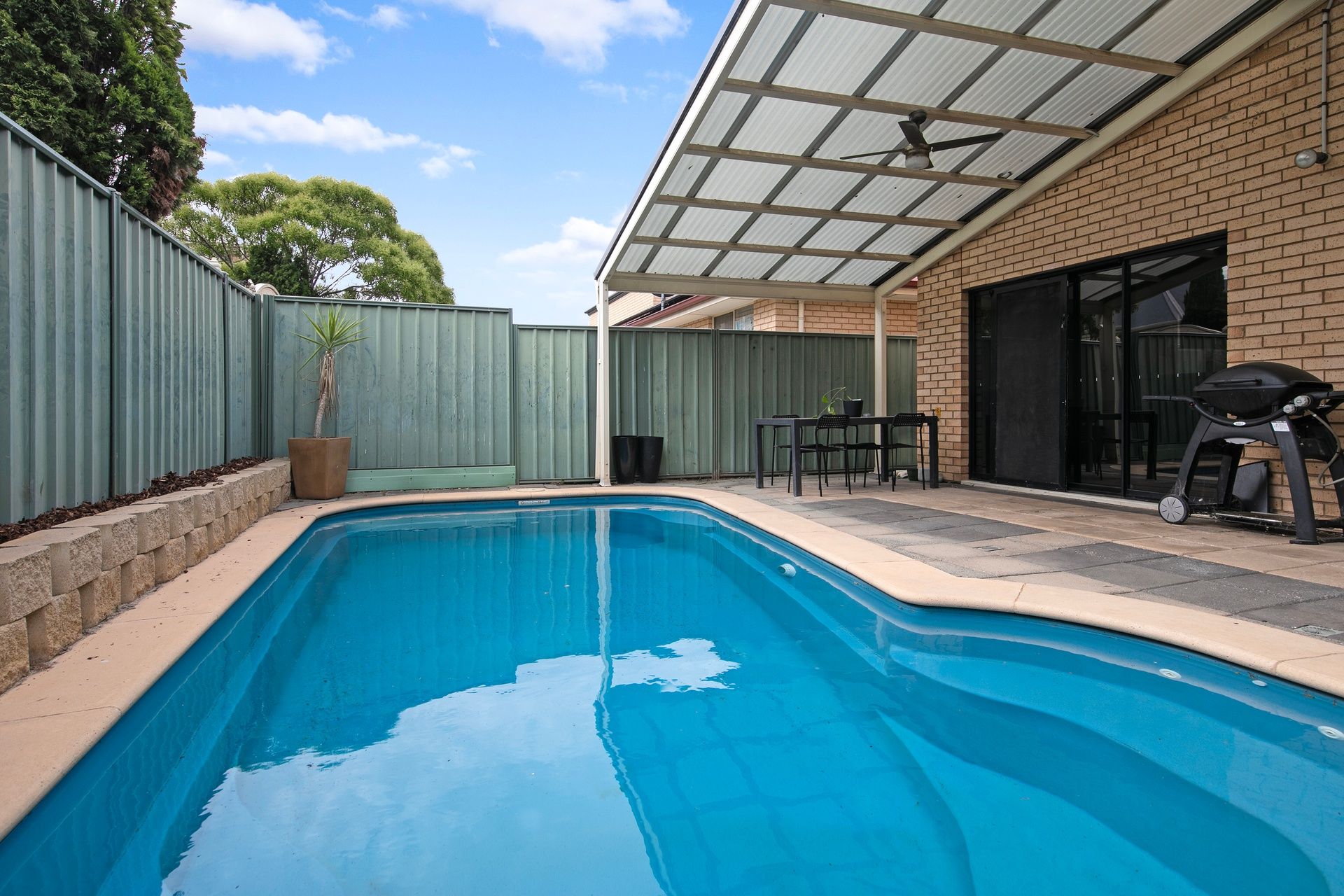 • Living/dining area opens to paved courtyard with pitched pergola and in-ground pool