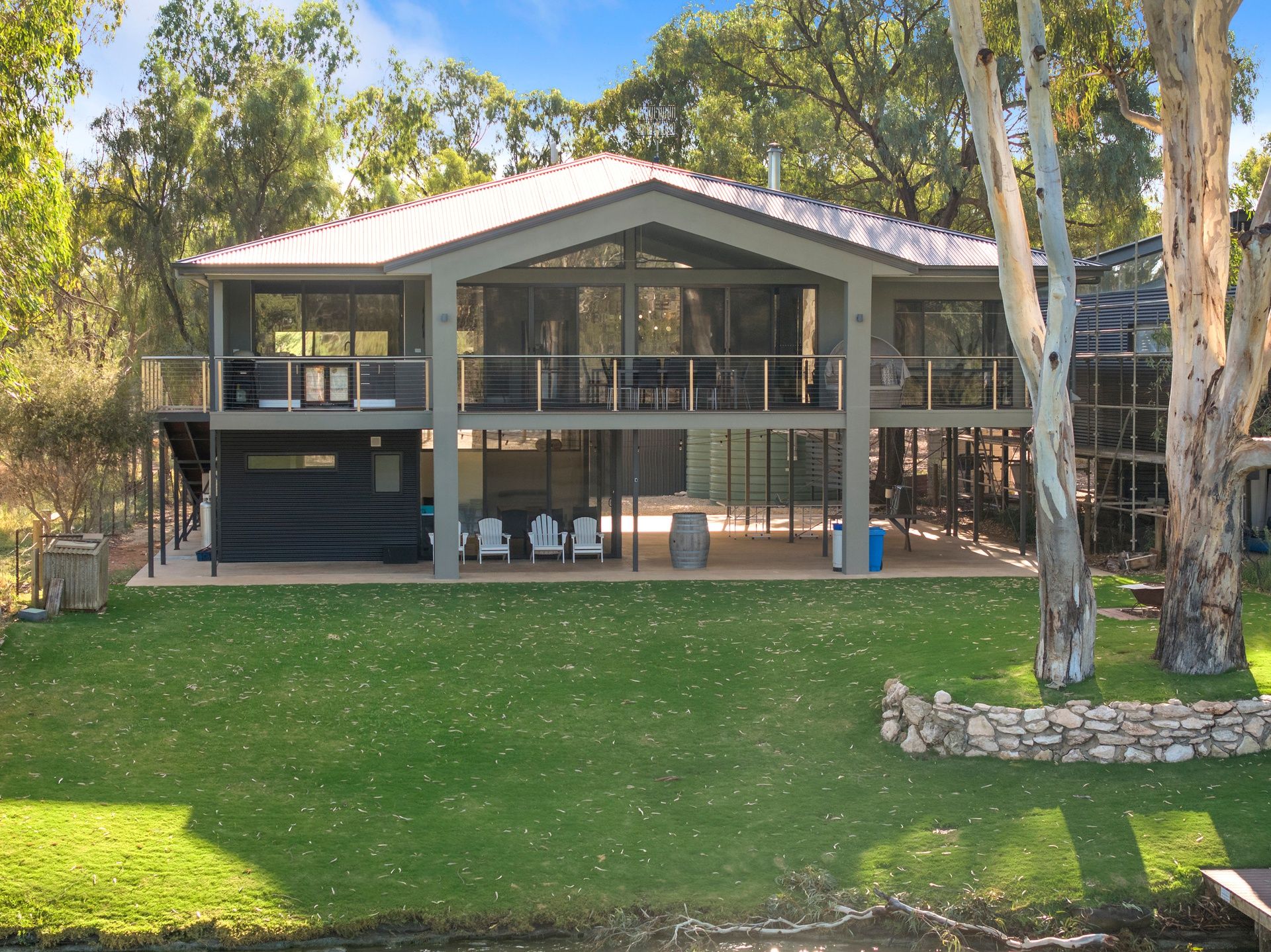 Beach front with lawns running down to the water, from the downstairs living area with kitchen BBQ and further accommodation makes this a choice decision if you are looking for a river shack property.